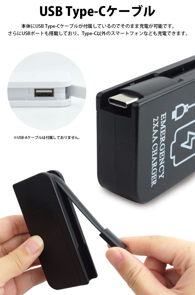 本体にUSB Type-Cケーブルが付属しているので乾電池をセットしたらそのまま充電が可能です。