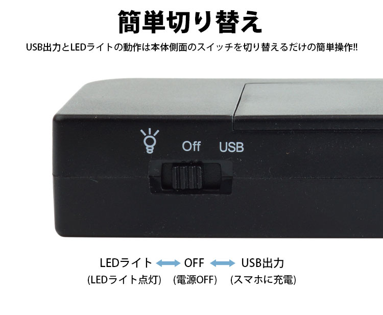 USB出力とLEDライトの動作は本体のスイッチを切り替えるだけの簡単操作!!
