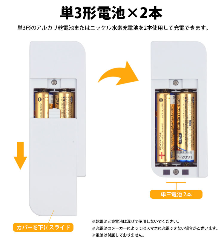 単3形のアルカリ乾電池またはニッケル水素充電池を2本使用して充電できます。