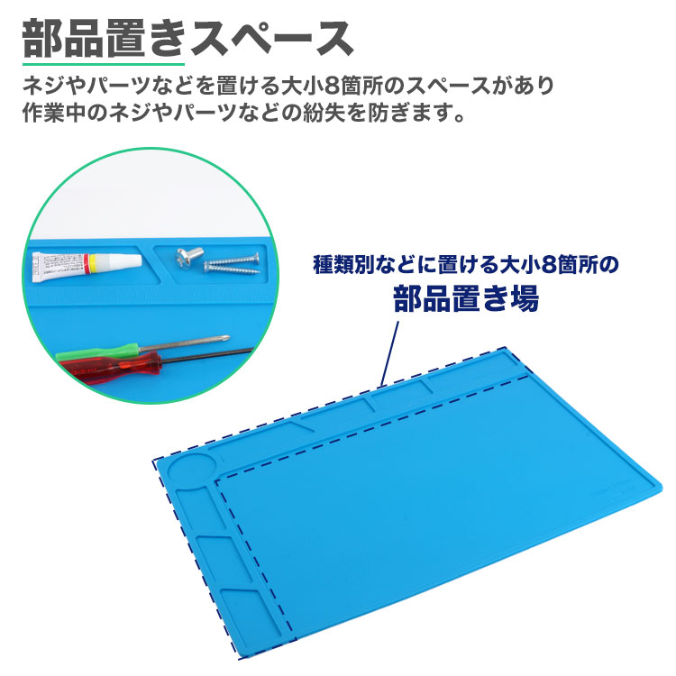 ネジやパーツなどを置ける大小8箇所のスペースがあり、作業中のネジやパーツなどの紛失を防ぎます。