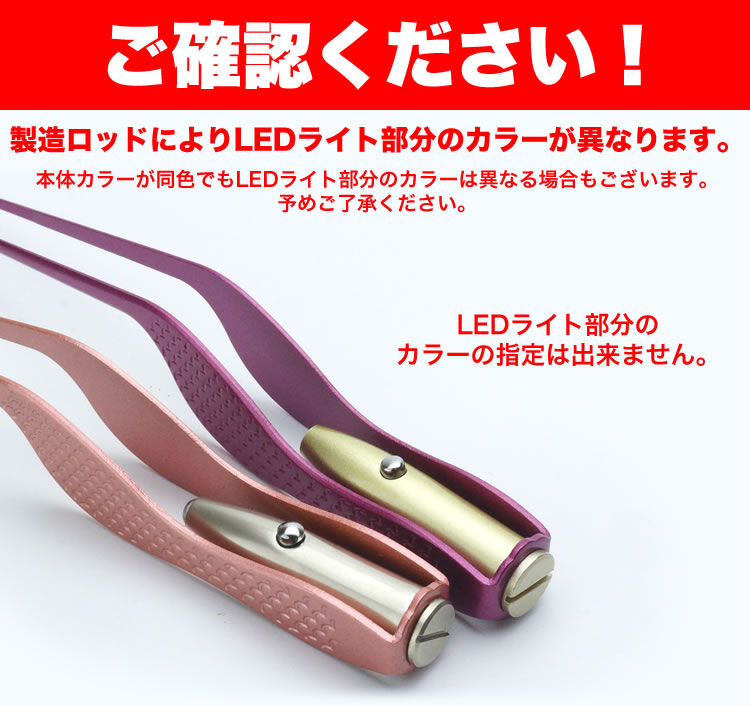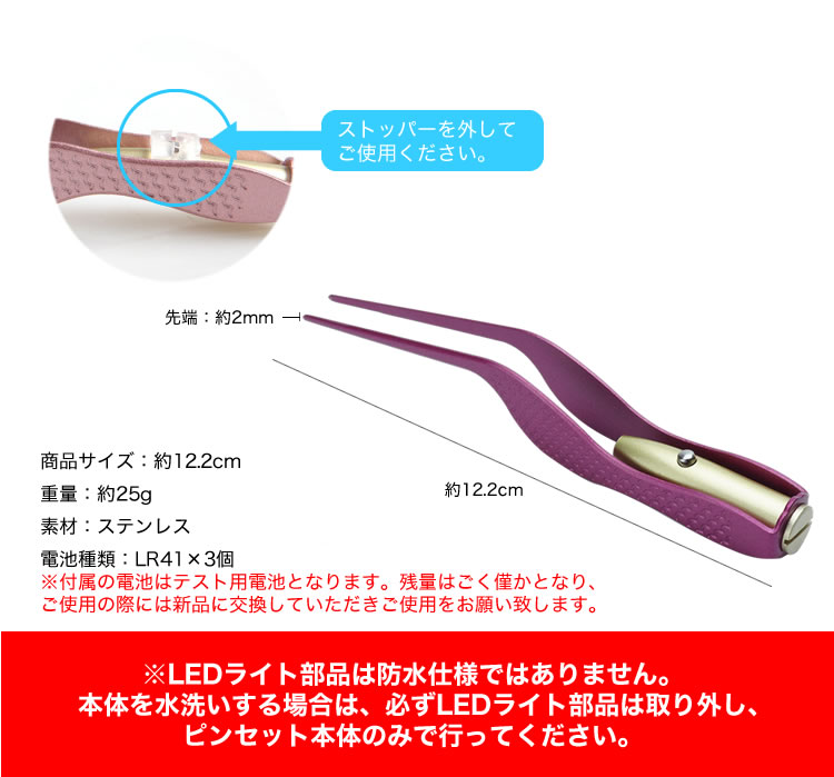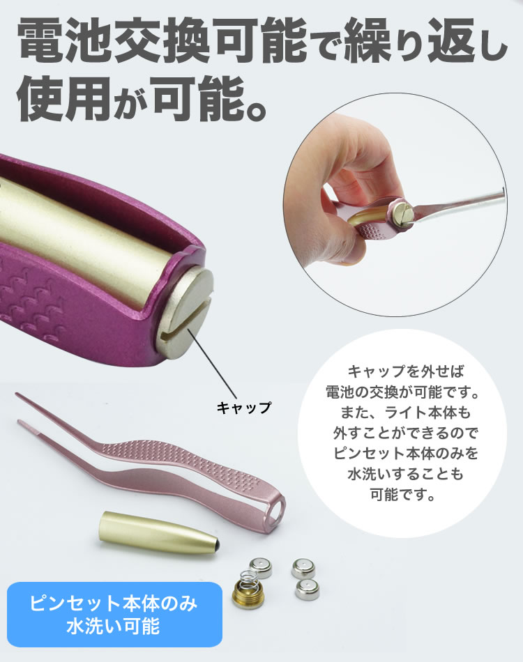 ピンセット本体を水洗いする場合は、必ずLEDライト部品は取り外し、ピンセット本体のみで行ってください。