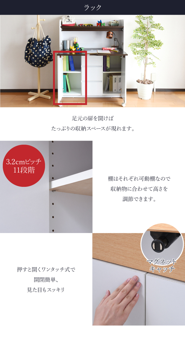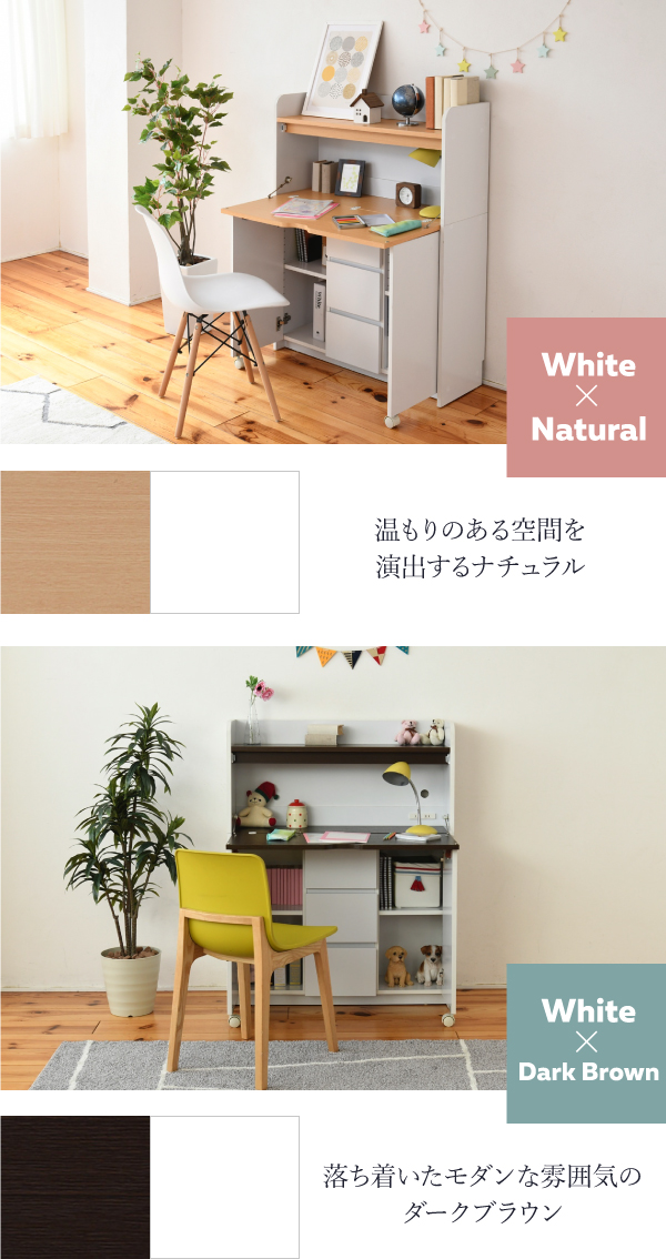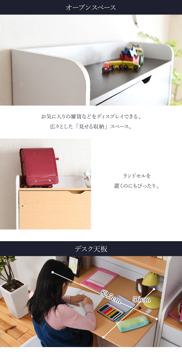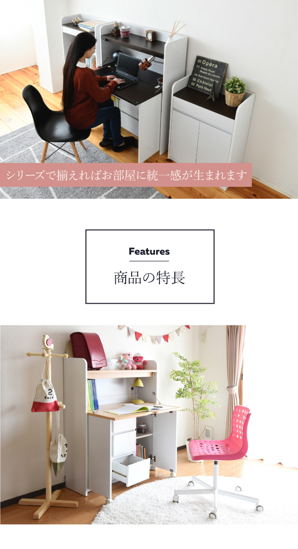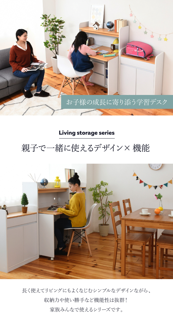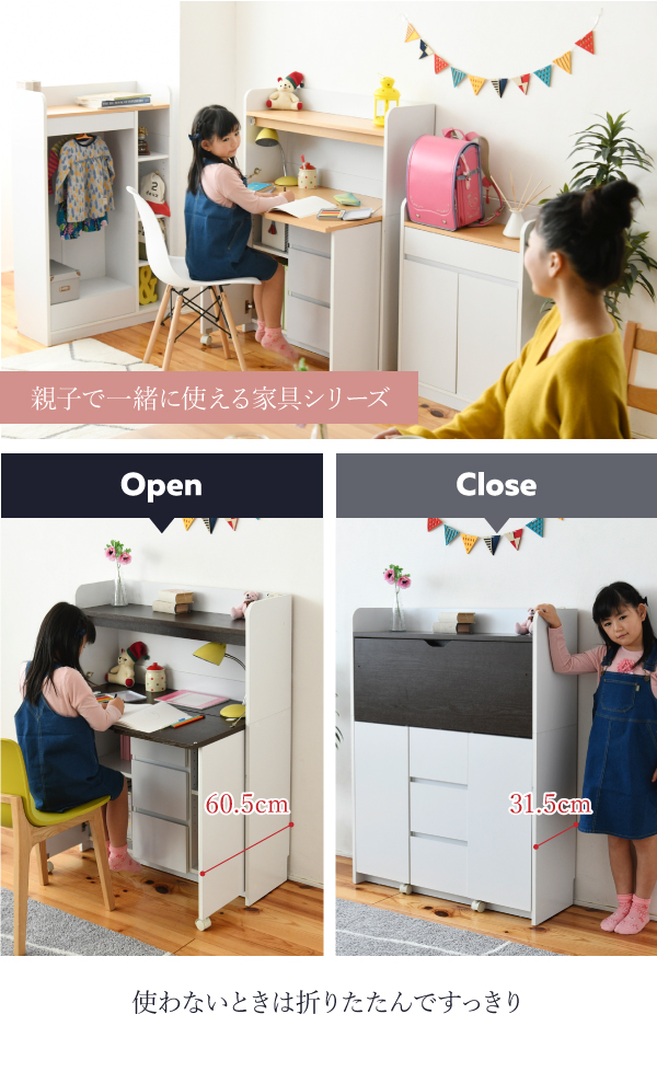 折り畳み式天板で使いたいときだけ広げて使わない時はすっきり畳んでおけるおしゃれなライティングデスク。薄型でリビングに最適。リビングでの子供の学習から、ママやパパのパソコンデスクとしてもお使い頂けます。上部にはランドセルなどを置けるオープン収納部、下部には扉収納部と3段の引出しで、収納力にも自信あり。コンセント、配線コード穴もあるので、PC、周辺機器の設置もOKです。