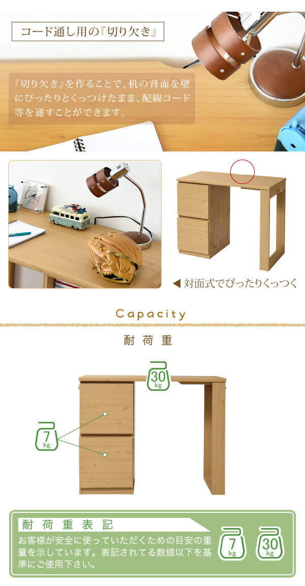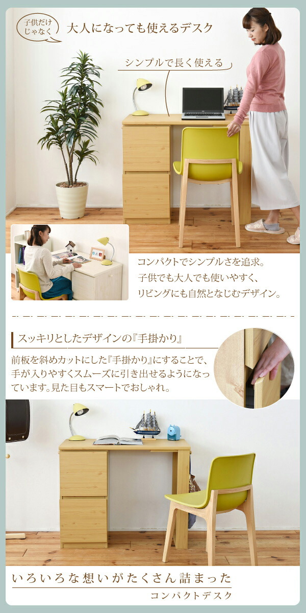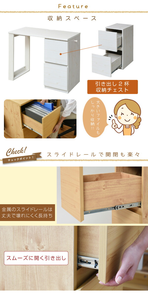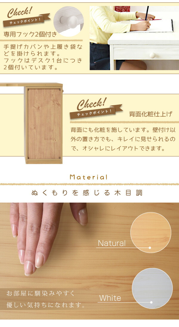 シンプルでおしゃれなデスク。収納力抜群の深引き出しが2杯、手提げ袋やトートバッグがかけられるフック付きがポイント。カラーはナチュラルとホワイトの2色展開で子供用は勿論、大人用としてもお使い頂けます。