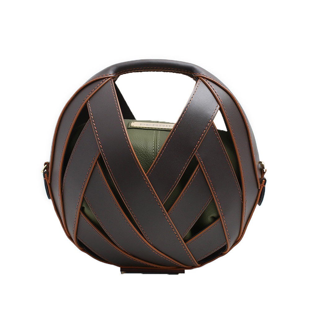 ペラン(PERRIN PARIS)レザー バスケット織り 2WAY ショルダーバッグ(ダークブラウン カーキ)