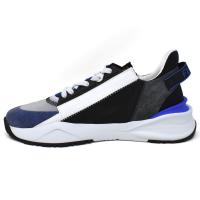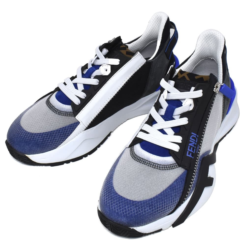 フェンディ(FENDI)のスリッポンスニーカーです。調節可能な伸縮素材のシューレース、サイドジップ、Fの文字を刻印した波形ソールが特徴的な、スリッポンスニーカー。かかとに型押ししたFENDI FLOWのレタリング。ブルー、ブラック、グレーのスエードと複数のテクニカルファブリックを使用。FFモチーフを入れたLYCRARのシュータン。高さ35mmにデザインし、ブラックのFディテールを斜めにあしらった、ホワイトのラバー製ランニングソール。