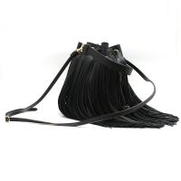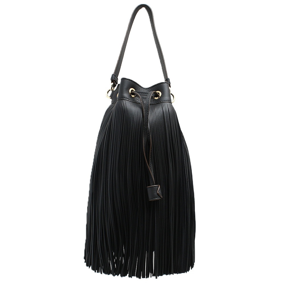 ジェイアンドエムデヴィッドソン(J&M DAVIDSON)レザー 斜めがけ 無地 シンプル フリンジ バケツ型 ドローストリング 巾着型 2WAY ショルダーバッグ(ブラック)