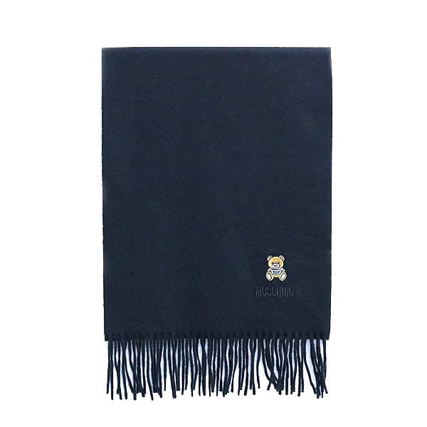 モスキーノ(MOSCHINO)フリンジ 無地 ロゴ刺繍 シンプル ミニマル マフラー(ブラック)