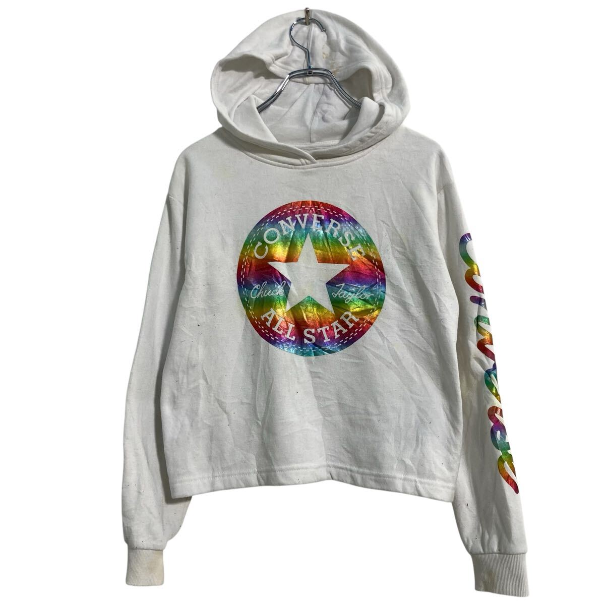 CONVERSE プリントスウェット パーカー キッズ XL 160 程 ホワイト コンバース プルオーバー 裏起毛 古着卸 アメリカ仕入 a703-5089