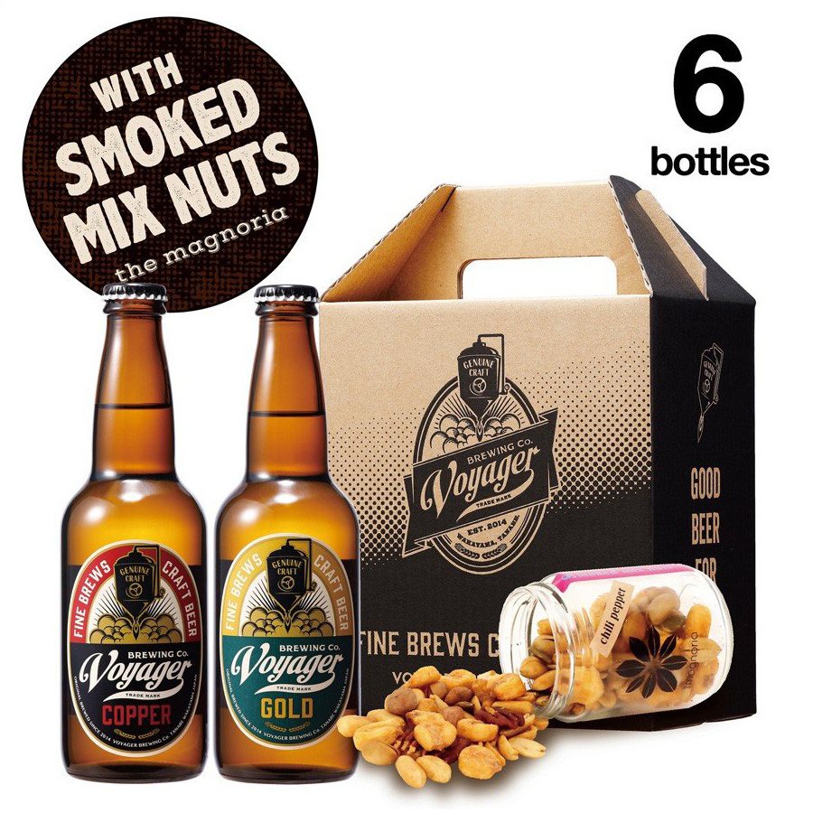 [ご確認下さい]ご依頼主様とお届け先様が同一で、熨斗をご指定されている場合、手渡し用として梱包発送させて頂きます。VOYAGER BREWING(ボイジャーブルーイング)[COPPER]、[GOLD]の2種類各3本の6本セットに the magnoriaさんのビールによく合うスモークドミックスナッツを詰め合わせたギフトセットです。