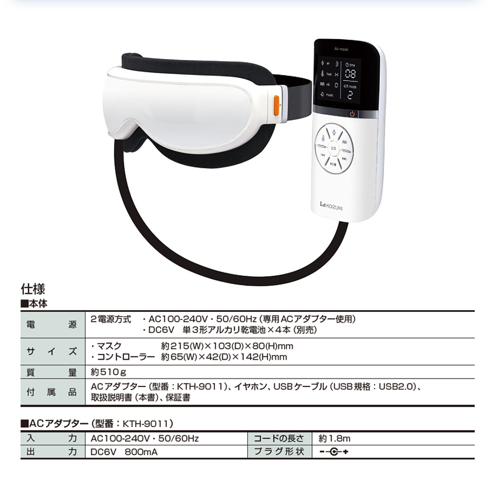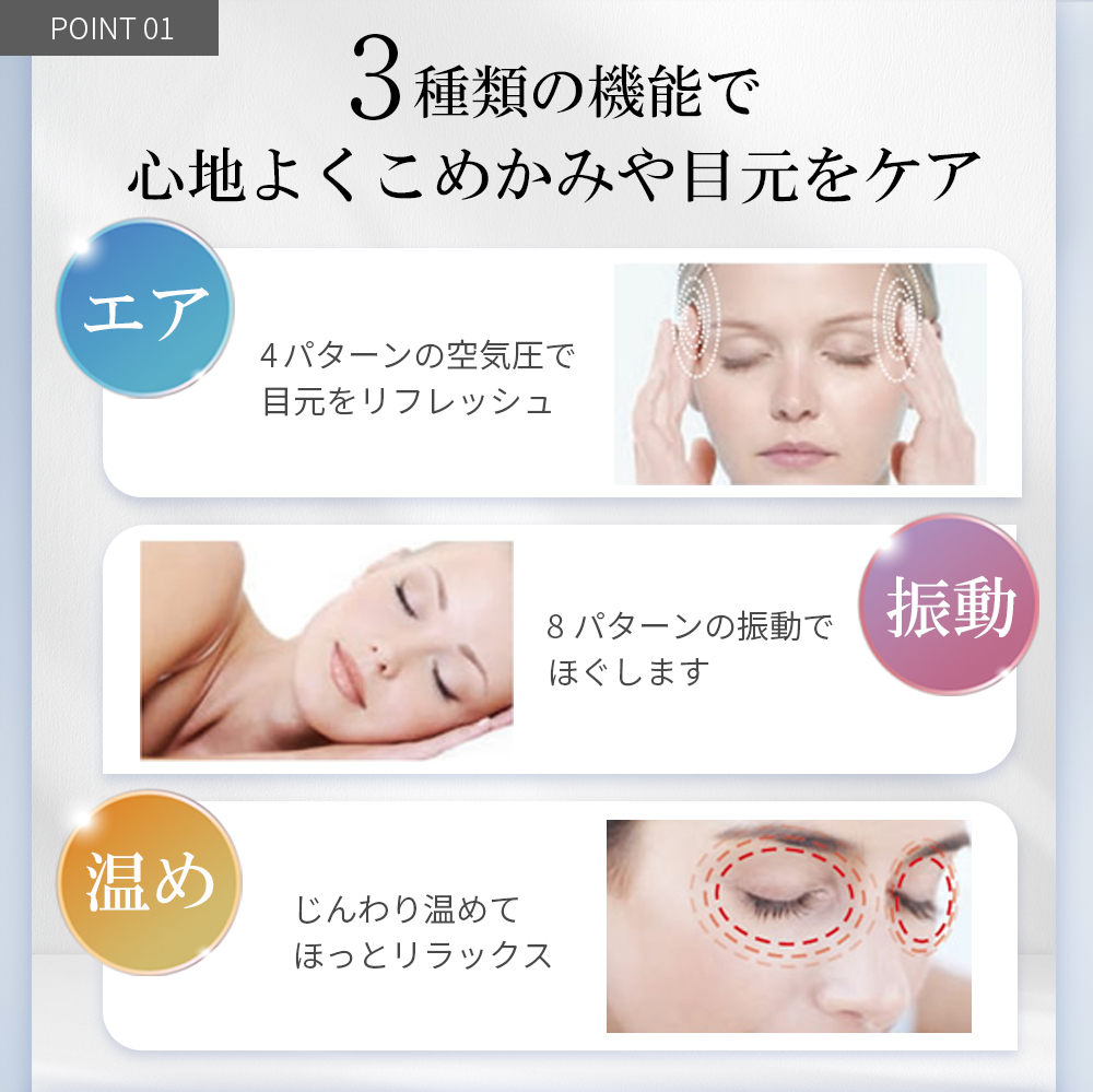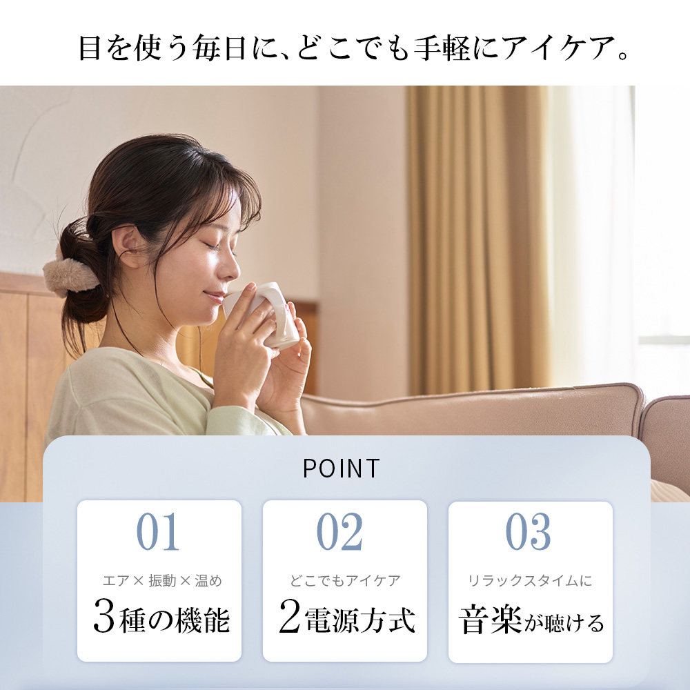 ●心地よい「エア・温め・振動」機能で、こめかみや目元をケアするアイマスクです
