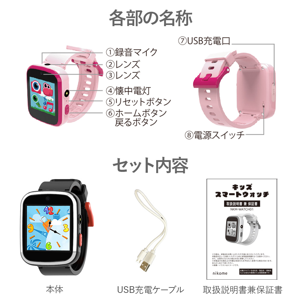 キッズスマートウォッチ 腕時計 子供用 おもちゃ 5歳 6歳 7歳 8歳 知育 学習 タイマー 8GB カメラ 録音 音楽 歩数計 アラーム nikome NKM-WATCH01