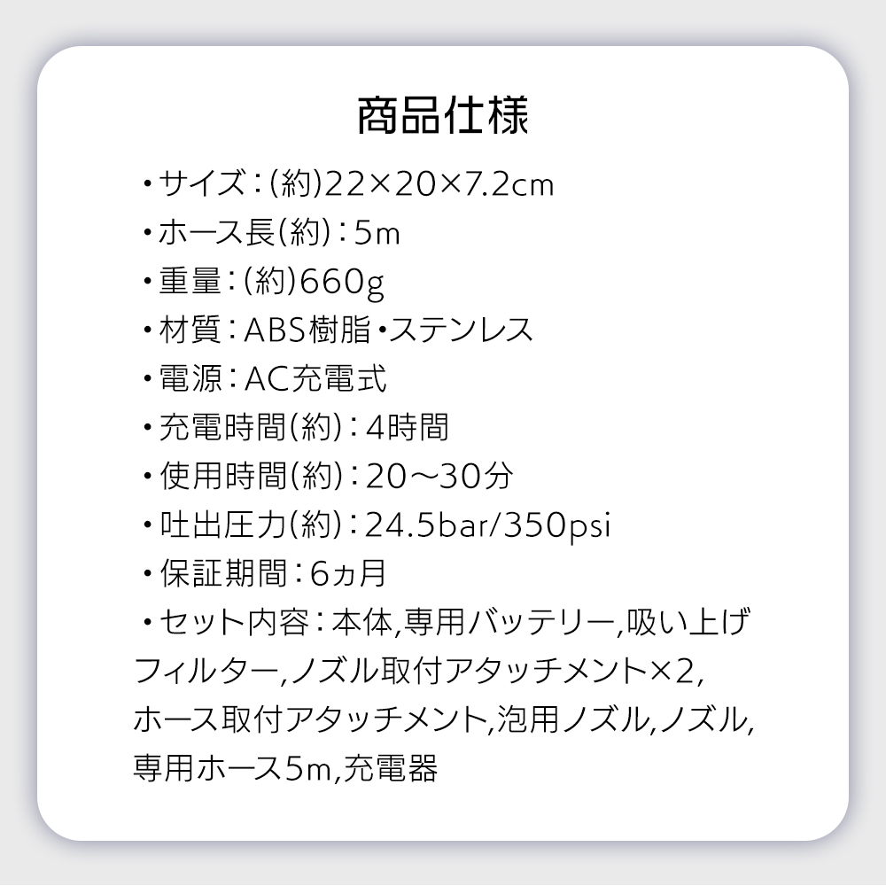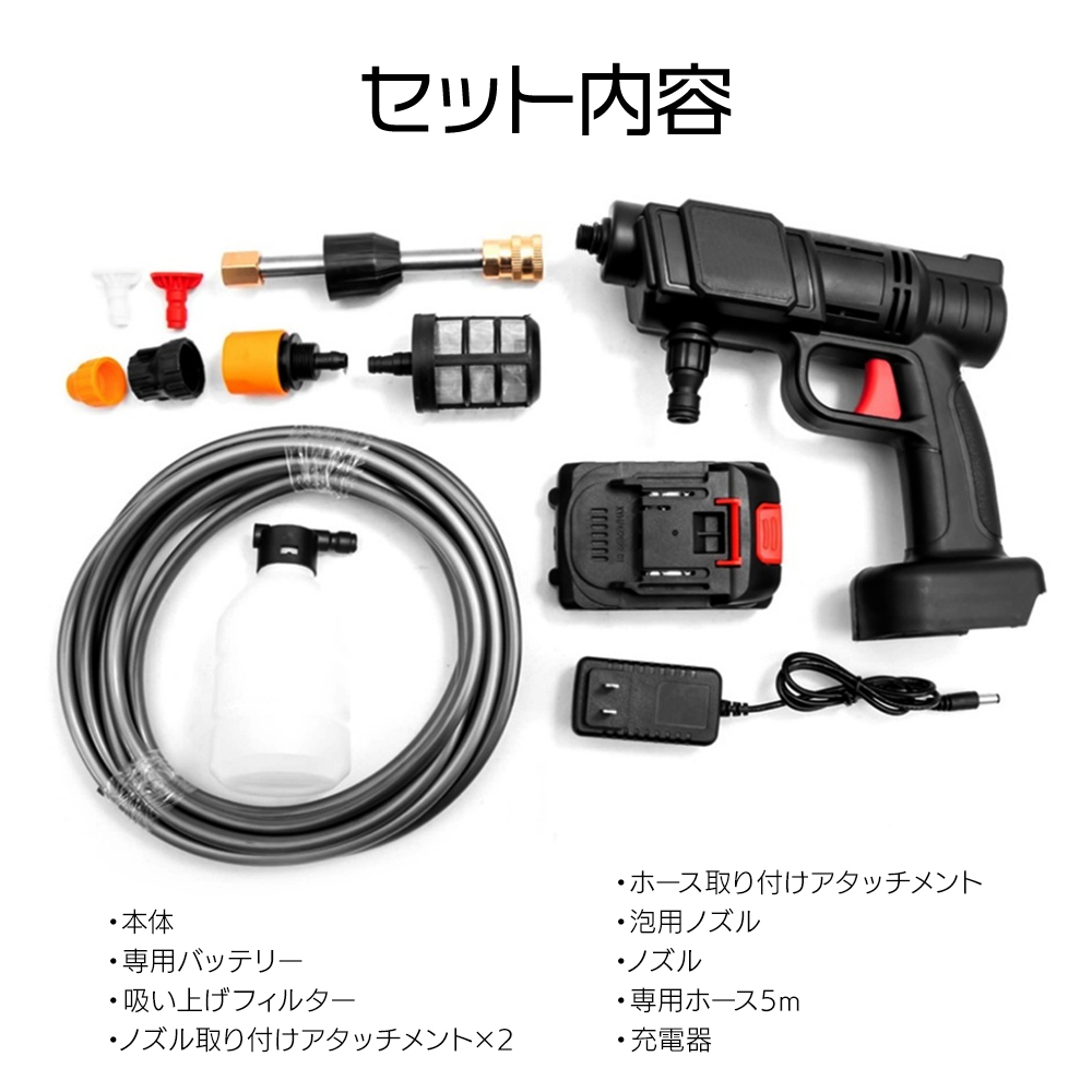 ホース取付アタッチメント、泡用ノズル、専用ホース5m、充電器