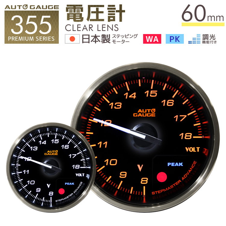 電圧計 車 バイク オートゲージ 60mm プレミアムシリーズ 日本製モーター 2色バックライト ワーニング付 355シリーズ 追加メーター 後付け AUTOGAUGE