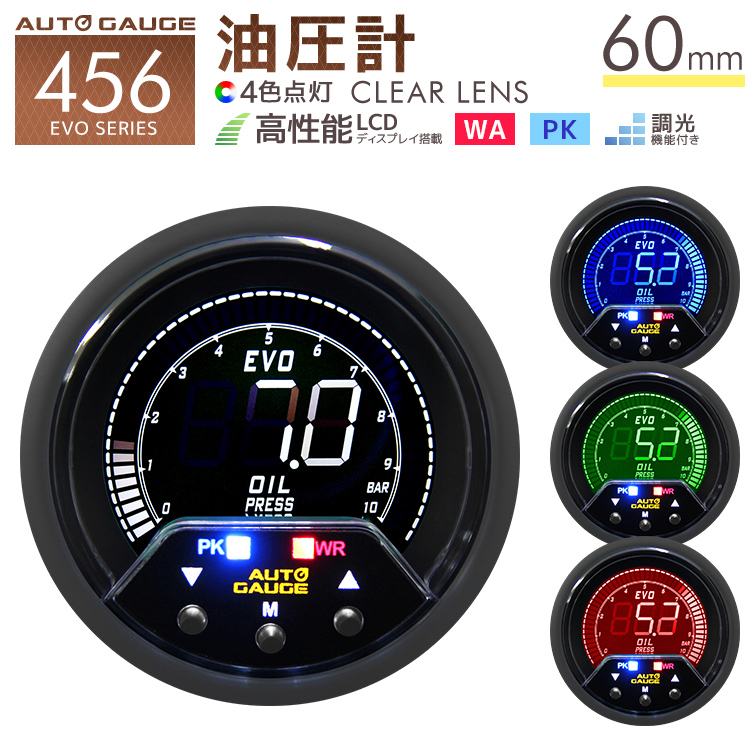 オートゲージ 油圧計 60mm 4色バックライト 456シリーズ 日本製ステッピングモーター ピークホールド 追加メーター 後付け 車 AUTOGAUGE