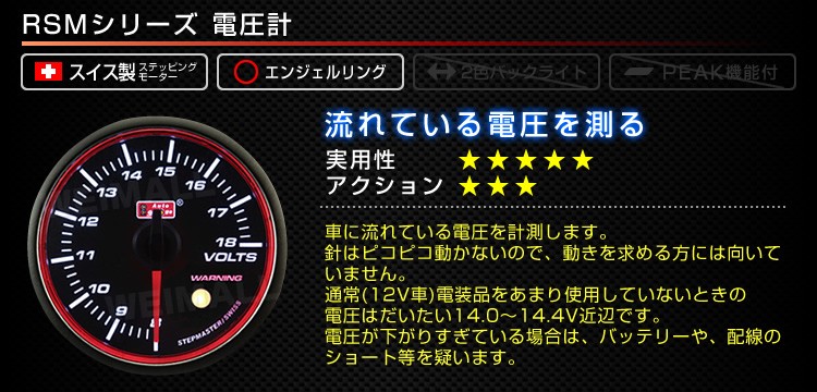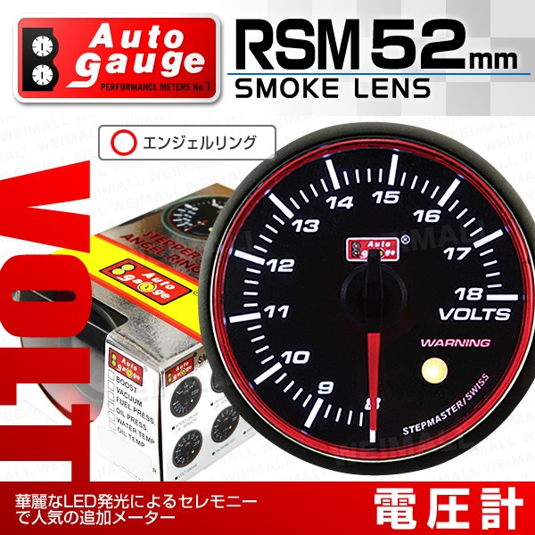 電圧計 車 オートゲージ バイク 52mm スイス製ステップモーター スモークフェイス 追加メーター 後付け ホワイトLED RSMシリーズ AUTOGAUGE