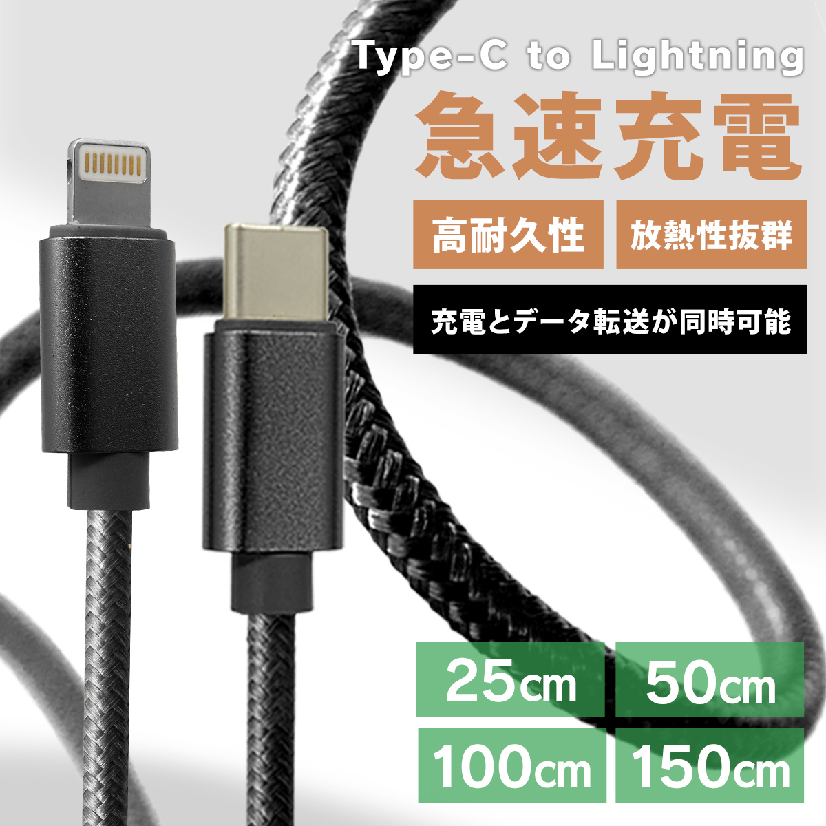 充電器 急速充電 iPhone ライトニングケーブル 充電ケーブル Type-C to Lightning タイプC 25cm 50cm 1m 1.5m 断線防止 高性能チップ USB ナイロン編み