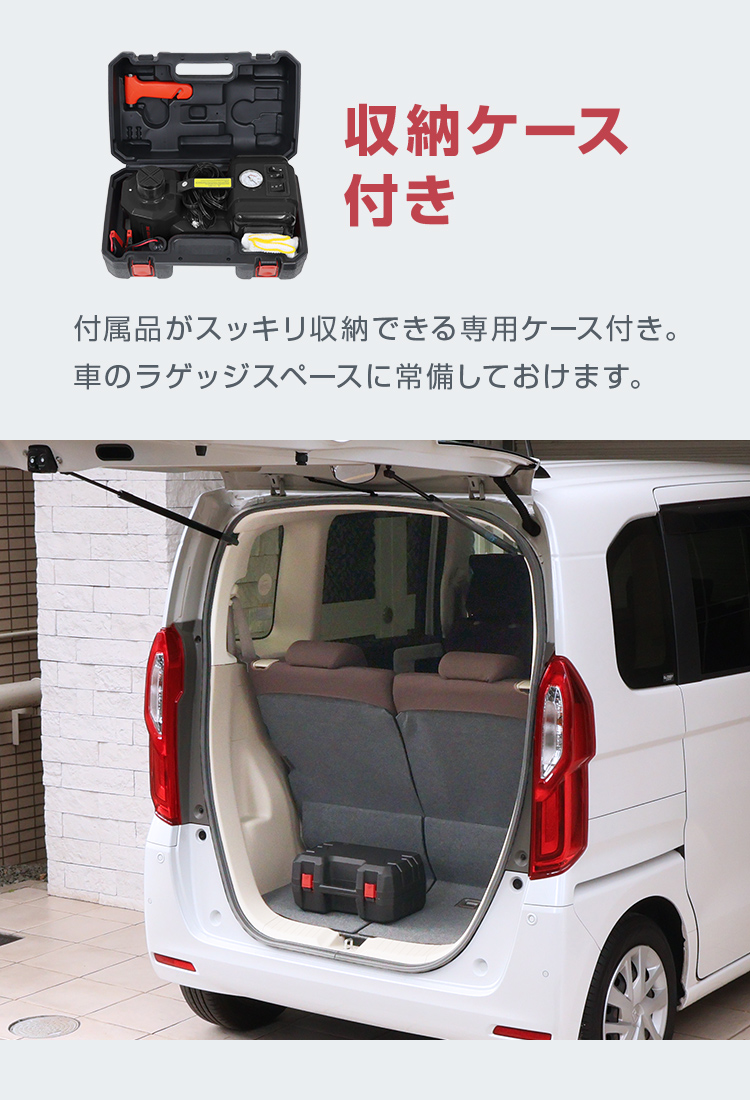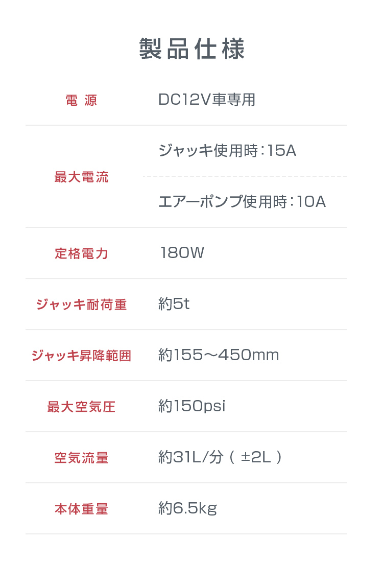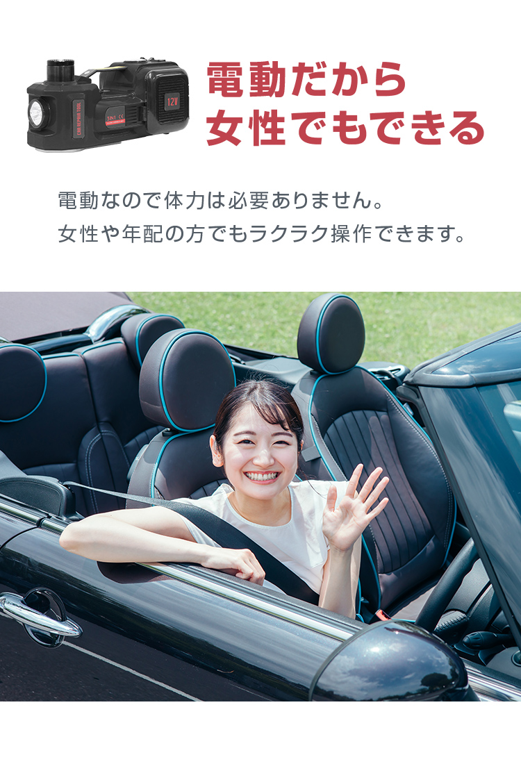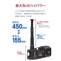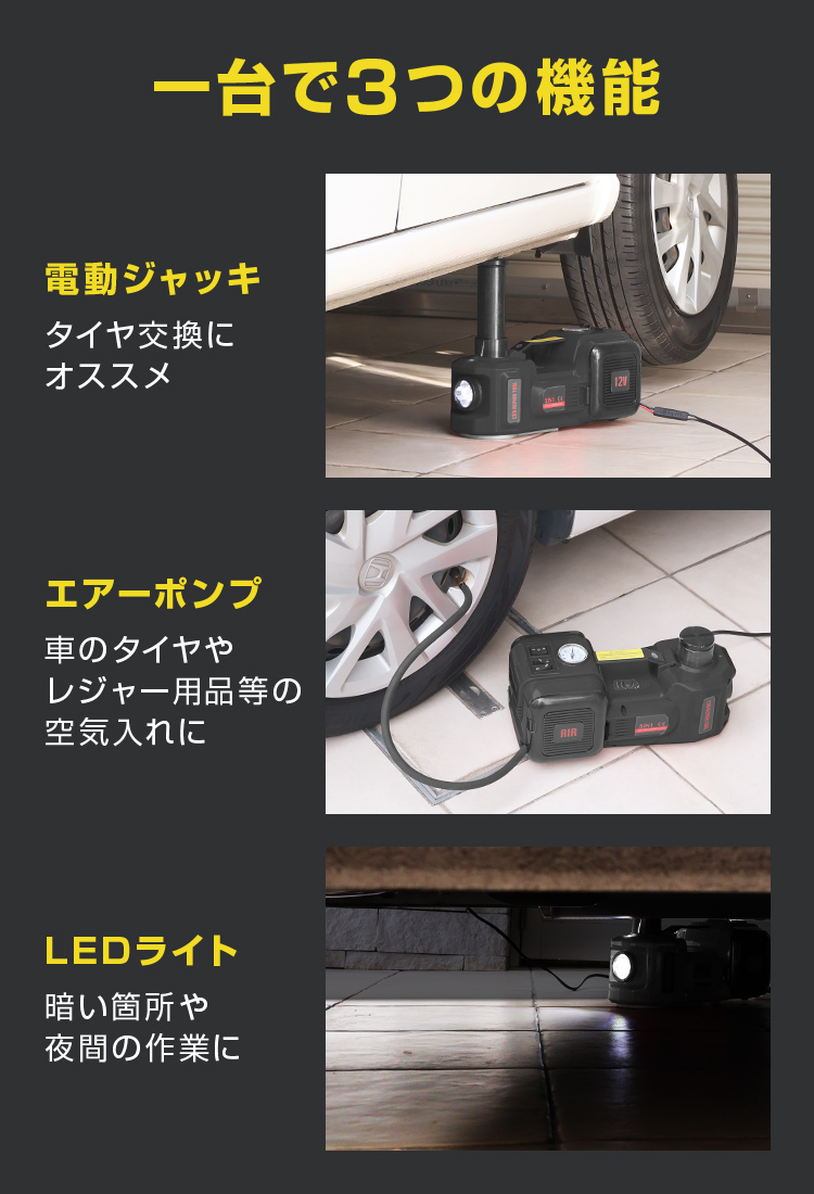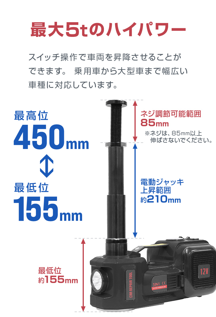 最大5トンまでの車両を135〜450mmの範囲でジャッキアップできる、電動油圧ジャッキ用エアーポンプです。