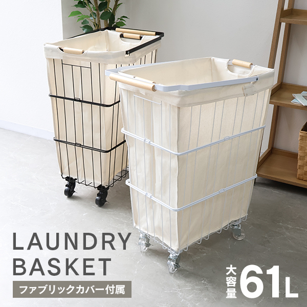 ランドリーバスケット 取っ手付き 大容量 61L ハンドル付き 2WAY キャスター付き ワイヤーバスケット ランドリーワゴン 洗濯かご 脱衣かご 北欧 天然木