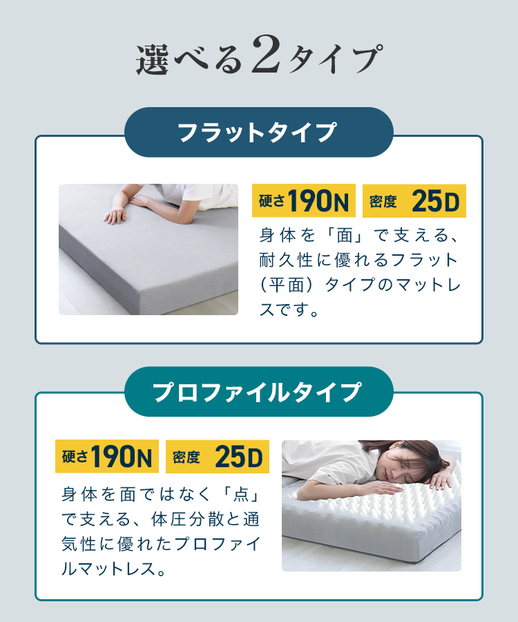高反発のウレタンフォームは弾性が高く、適度な硬さで身体を支えるので、底つき感なくへたりにくです。