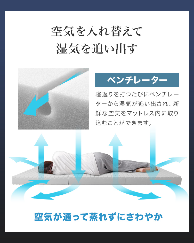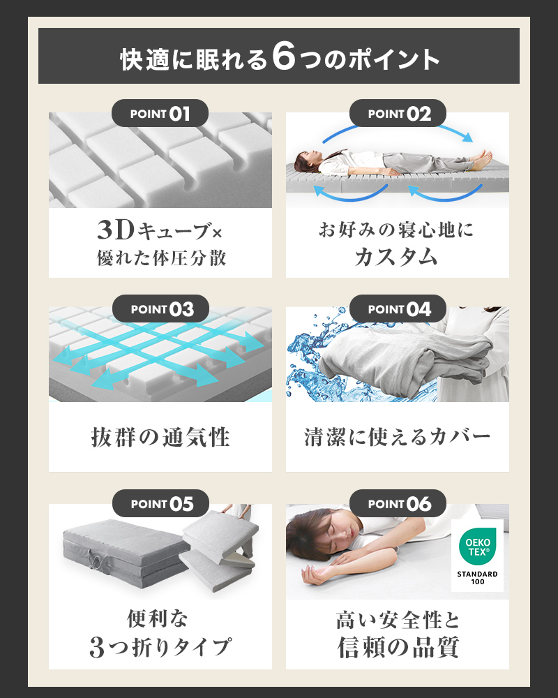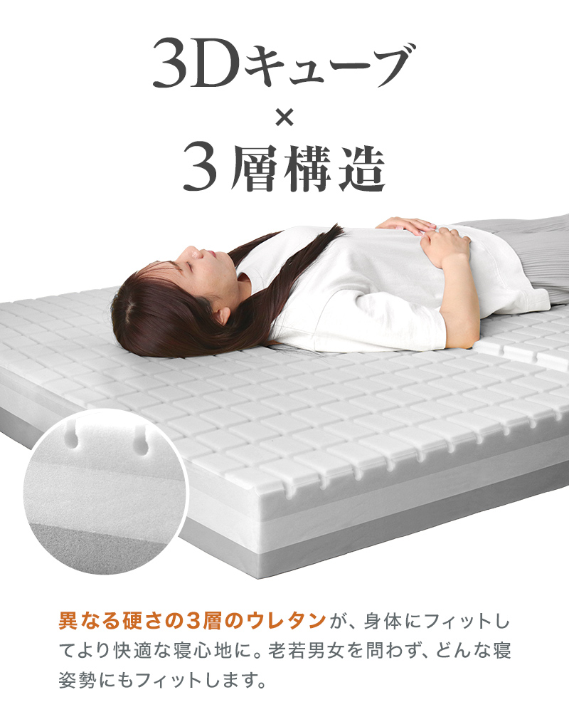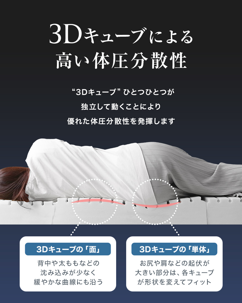 高い体圧分散性で快適な姿勢を保つ3Dキューブマットレス。