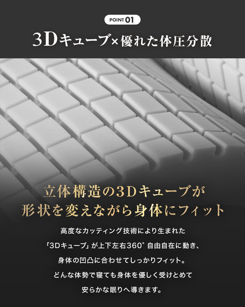 高品質のウレタン製3Dキューブが体圧を均等に分散し、体の各部位をしっかりとサポートします。