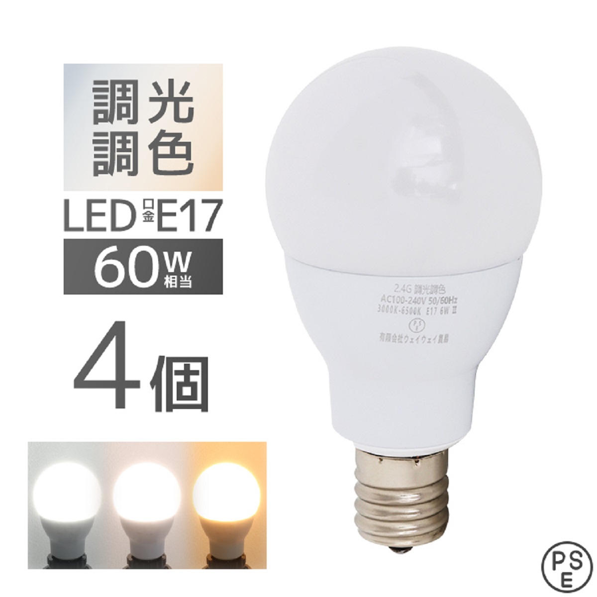 LED電球 4個 調光調色 LED照明 口金E17 60W相当 広配光 調光器対応 工事不要 照明 電球 LED LEDライト 昼光色 昼白色 電球色 60形相当 リモコン対応