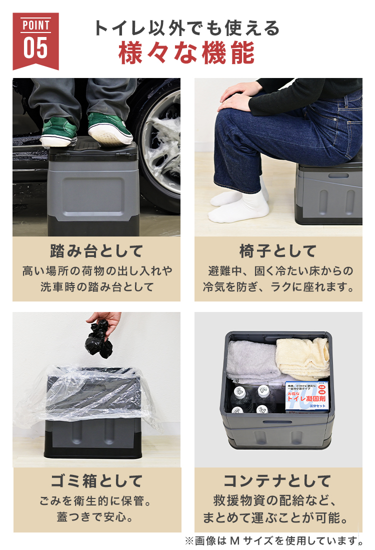 非常時や災害時だけでなく、イスや踏み台、収納ボックスやゴミ箱としても使えます。
