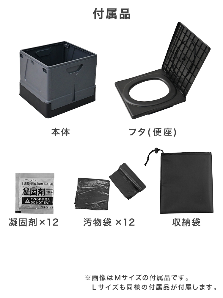 本体×1、フタ(便座)×1、凝固剤×12、汚物袋×12、収納袋×1