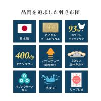日本製、ダウンパワー400dp以上、パワーアップ加工、オゾンクリーン加工、立体キルト加工、二重縫製、布団留めループ8箇所付き、洗える