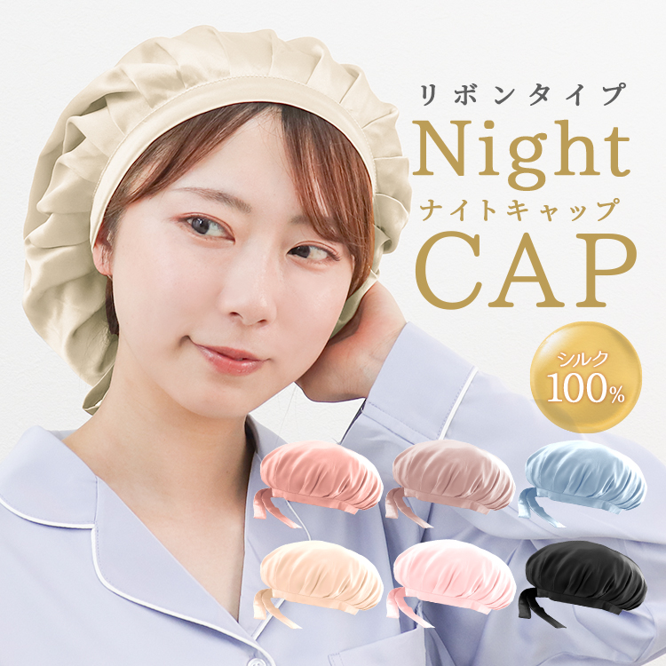 ナイトキャップ シルク リボン付 シルクナイトキャップ ヘアケアキャップ ルームウエア ロング 就寝用 睡眠 美髪 ダメージケア 保湿 パサつき かわいい おしゃれ