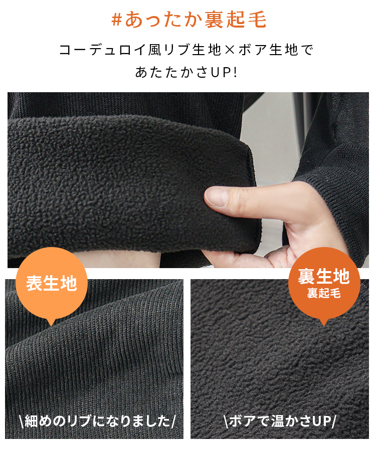 裏地はふわふわの上品な手触りで、着用の際にひんやりしない裏起毛。