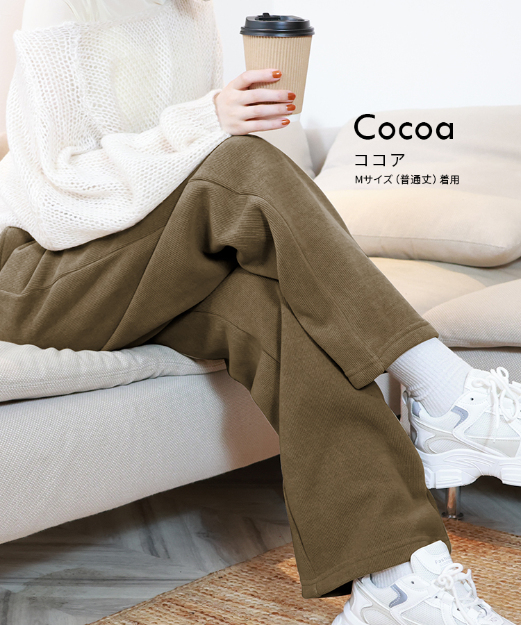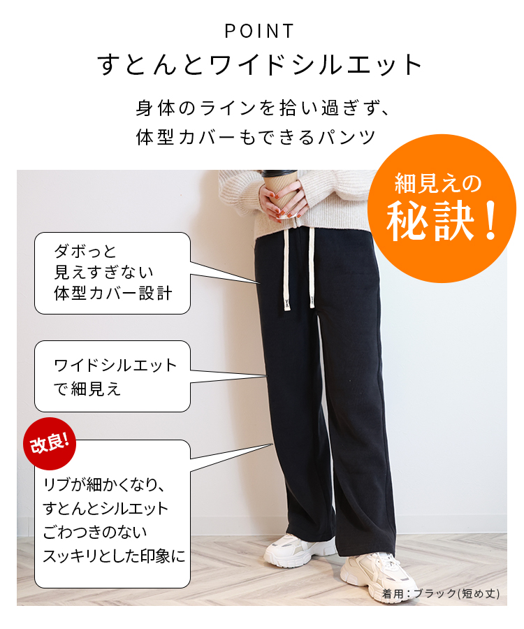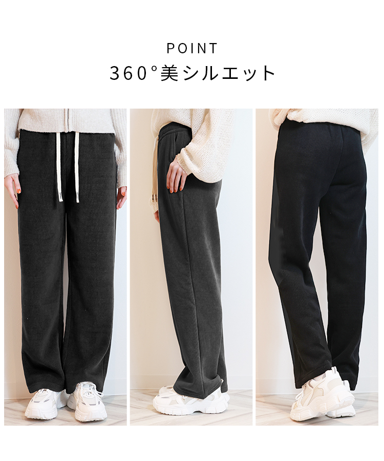 脚長効果抜群の美シルエットが特徴のあったか裏起毛ワイドパンツ。