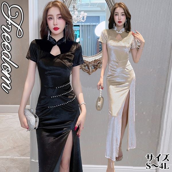 ドレス ロングドレス キャバドレス チャイナドレス 大きいサイズ チャイナ襟ウエストビジュの前スリット入りロングドレス S M L 2L 3L 4L サイズ セール