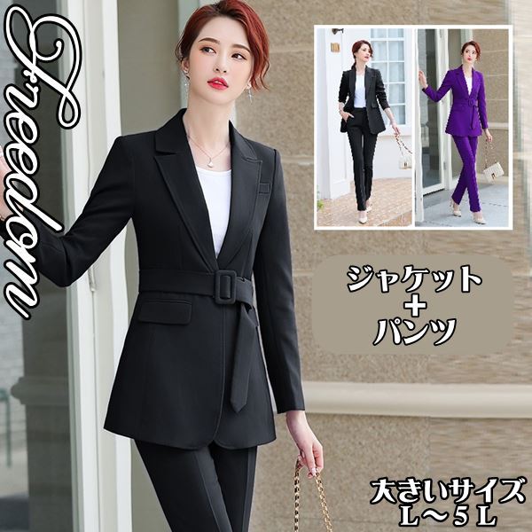大きいサイズ フォーマル OL 卒業式 入学式 一着多役!ベルト付きジャケット&パンツのセットアップレディーススーツ L 2L 3L 4L 5L サイズ セール