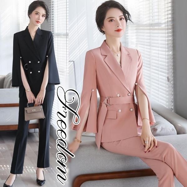 大きいサイズ スーツ 卒業式 可愛いデザインで一着多役!スリットスリーブジャケット&パンツのセットアップレディーススーツ 2L 3L 4L 5L サイズ セール
