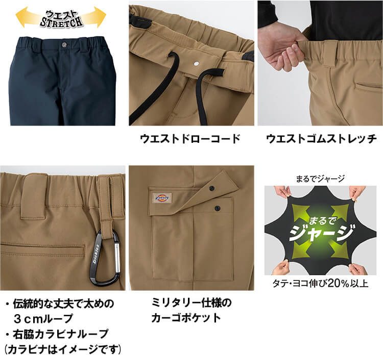 | Dickies トップスの銘品、ミニマルなデザインとショート丈のクラシックジャケット。 世代を問わず愛されてきたデザインはそのままに、柔らかさ、軽さ、ストレッチ性等の機能性をプラスし現代版にアップデートしたインスパイアモデル。 ・ファスナーポケット:両脇をファスナーポケットにすることで物が落ちにくい便利な仕様 ・裾ドローコード:ドローコードで裾を調整することでき、シルエットの変化も楽しめる仕様 ・衿チンストラップ:衿のバタつきをおさえ、衿をきれいに立てることができるチンストラップ ・ウエストゴム:ウエストを総ゴム仕様にすることで動きやすく快適に着用可能 ・ウエストドローコード:内側ドローコード仕様により、ベルトレスで着用可能 ・便利なパンツポケット:ペン差し付きフラップのミリタリーポケット仕様 ・カラビナループ:カラビナをかけることが可能な右脇カラビナループ仕様 |