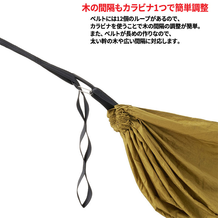 カラビナで固定するだけで設置完了のお手軽ハンモック。