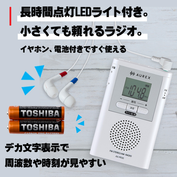 【長時間LEDライト搭載。便利なLEDライト付きポケットラジオ AX-PR30】東芝製単4形乾電池(マンガン乾電池)が付いているので、すぐにラジオをお使いになれます。