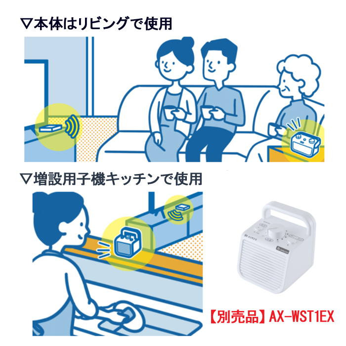 ■ 業界初の子機を増設できるブロードキャスト機能を搭載。1台の送信機から、本体と増設用子機に同じテレビ音声を同時に送信でき、1台はリビング、1台はキッチンなど、異なる場所にいてもクリアな音声を楽しめます。増設用子機※3は初回仕様時に送信機の同調ボタンを押すだけで簡単に接続でき、2回目以降は設定不要です。