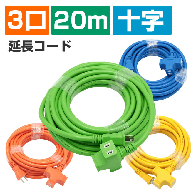 延長コード 20m 3口 耐寒性 超ソフト 十字延長コード 屋外 屋内 送料無料 15A 1500W 20M グリーン