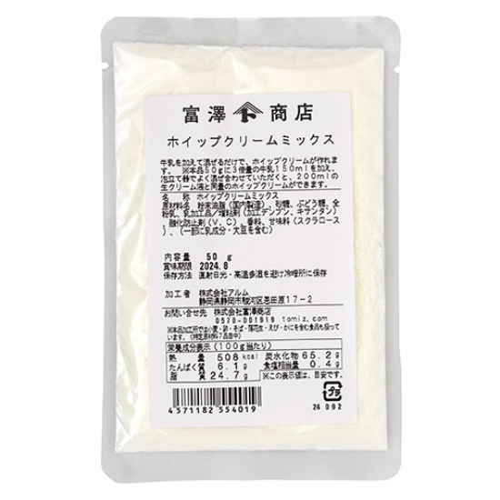 ■ご利用方法:本品50gに3倍量の牛乳150mlを加え、泡立て器でよく混ぜ合わせていただくと、200mlの生クリーム液と同量のホイップクリームができます。