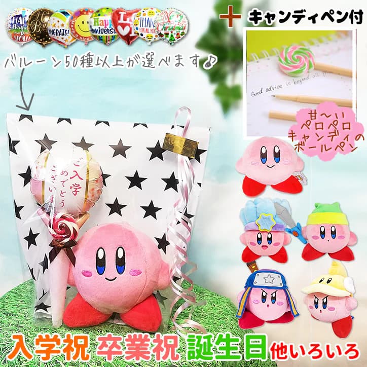 カービィ 入学 合格 卒業 お祝い 誕生日 プレゼント バルーン電報 ぬいぐるみ 星のカービィ(S)&キャンディ型ペン&選べるミニバルーンギフト3点セットM
