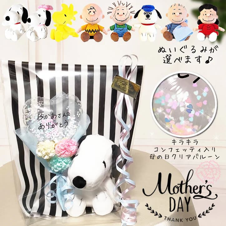 スヌーピーの仲間たちが小さなバルーン花束を持ってお祝いしてくれます。