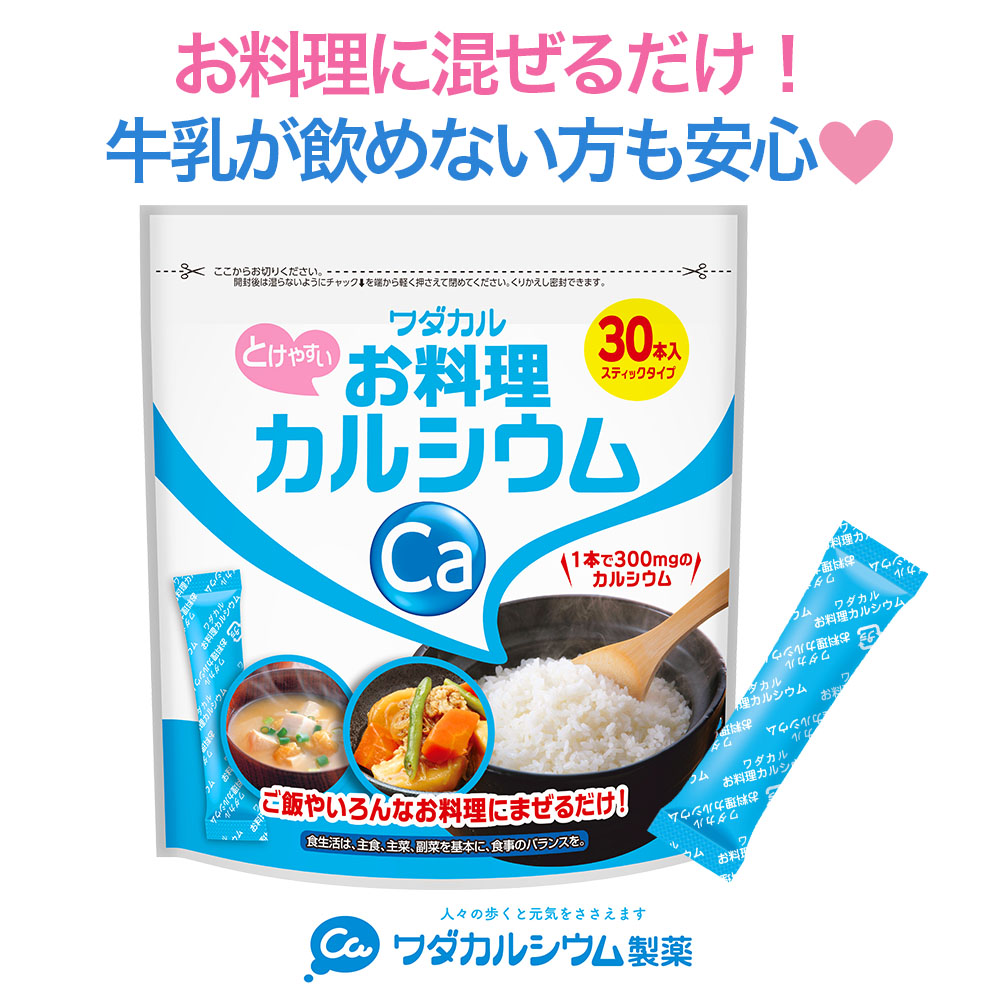 【料理に混ぜるだけで手軽に補えるカルシウム サプリメント】普段の食生活だけではどうしても不足しがちなカルシウム。ワダカル の「 お料理カルシウム 」なら1本で300mgの カルシウム が摂取できます。