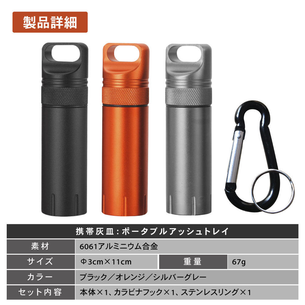 | 商品詳細 | ・商品名:携帯灰皿ポータブルアッシュトレイ ・素材:6061アルミニウム合金 ・サイズ: 3cm 11cm ・重量:67g ・カラー:ブラック/オレンジ/シルバーグレー ・セット内容:本体 1、カラブナフック 1、ステンレスリング 1 |