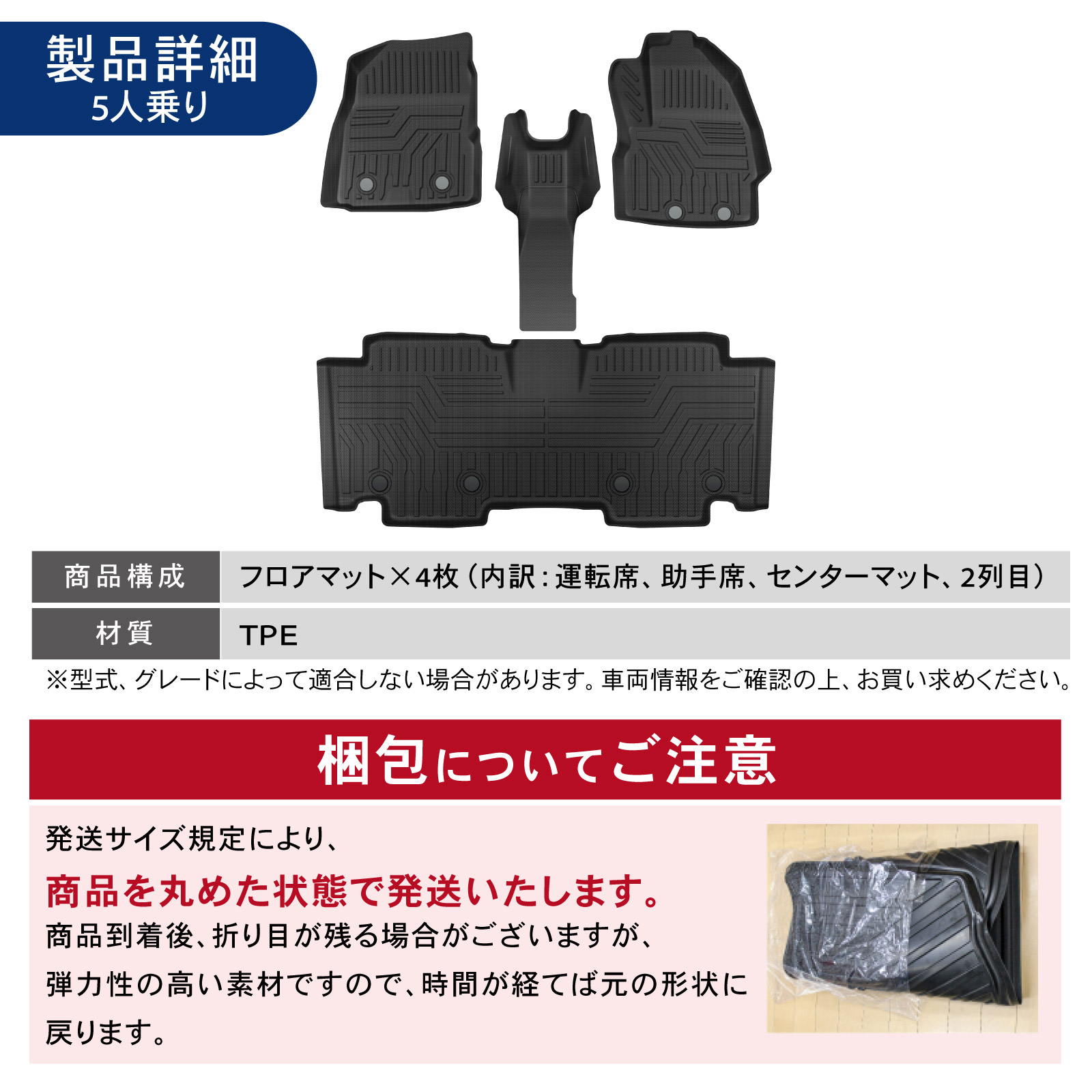 | 適合車種 | [適合車種 ] ・TOYOTA/トヨタ SIENTA/シエンタ [適合型式 ] ・MXPC10G MXPL10G MXPL15G [適合グレード ]・2WD 4WD ・5人乗り 7人乗り ・X G Z ・ハイブリッド X G Z 注意)ガソリン車・ハイブリッド車対応 [適合年代 ] ・2022年8月〜現行 [商品素材 ] ・ TPE [商品構成 ] 7人乗り:フロアマット 6枚 5人乗り:フロアマット 4枚 注意)年式・グレード・オプション等により適合しない場合が御座います。 形状をご確認いただいた上、お買い求めください。 |
