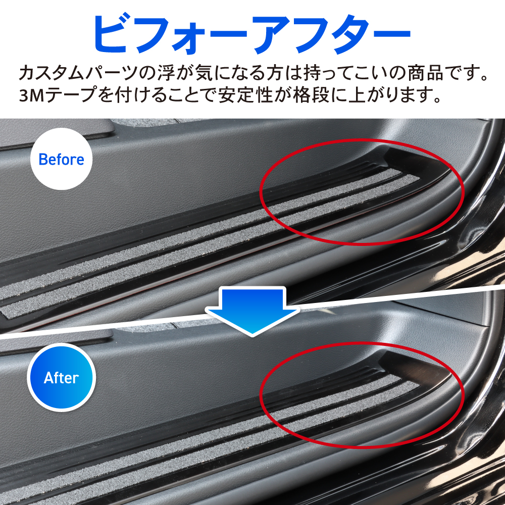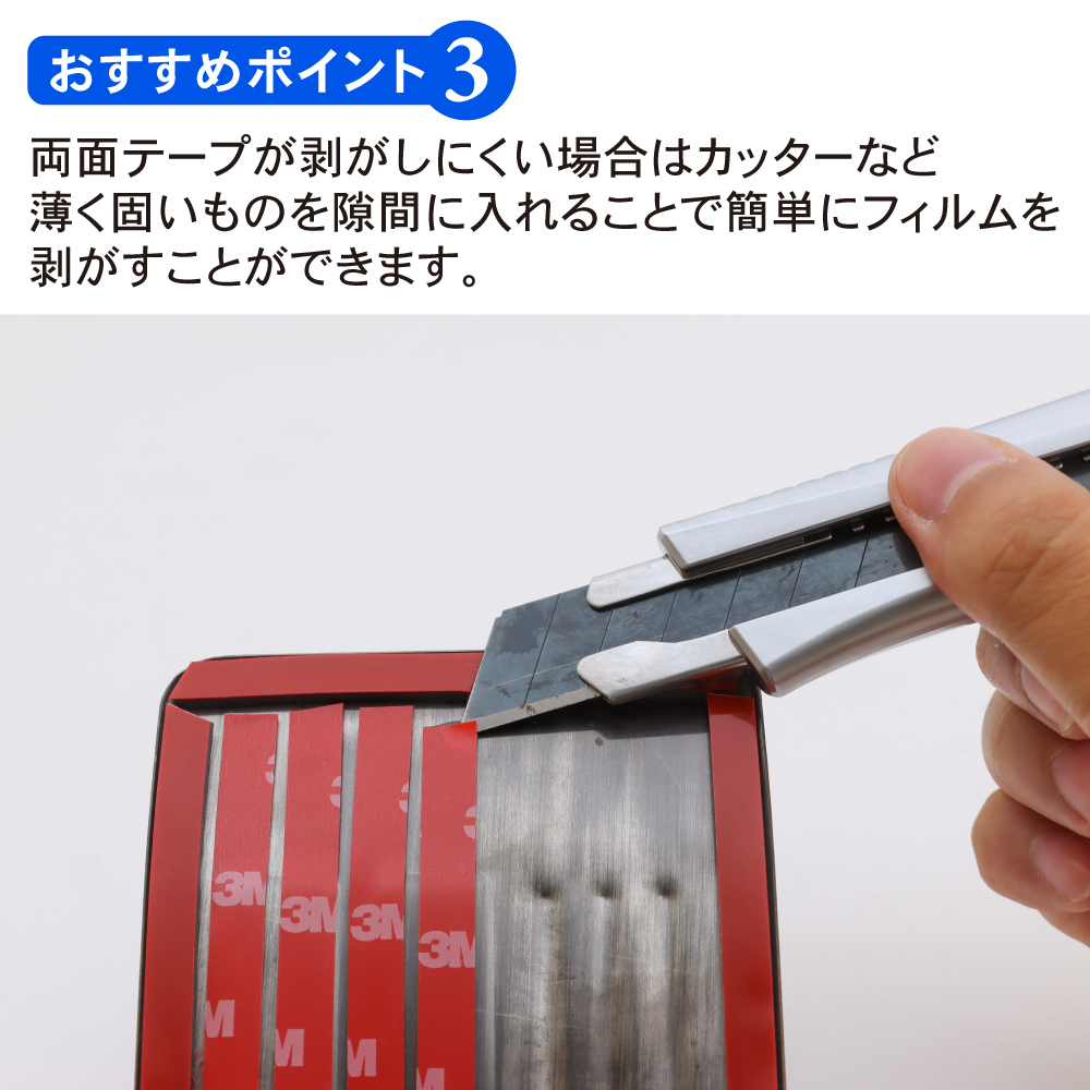 | 特徴 | ・POINT.1 「圧倒的 粘着力と耐久力」 3M社製の強力両面テープは長時間の耐久性があります。 お車の内装・外装問わず接着力を高め、あらゆる場面で大活躍します。 ・POINT.2 「隙間を徹底的に無くします」 カスタムパーツの浮が気になる方は持ってこいの商品です。 3Mテープを付けることで安定性が格段に上がります。 ・POINT.3 「曲がりにも対応 」 テープははさみやカッターなどで切り込みを入れると 湾曲した部分にもしっかりと対応できます。 ・POINT.4 「劣化防止」 両面テープは消耗品の為、劣化します。 劣化した場合もテープの上からさらに補強する事で車体との接触を防止します。 ・POINT.5 「簡単に剥がせる 」 両面テープが剥がしにくい場合はカッターなど薄く固いものを 隙間に入れることで簡単にフィルムを剥がすことができます。 |