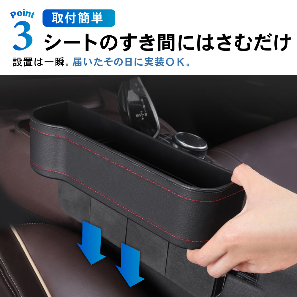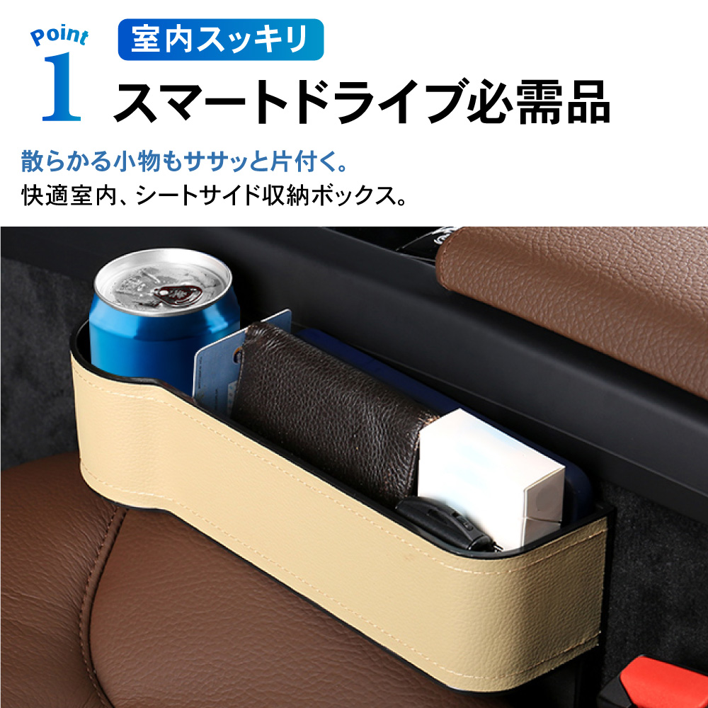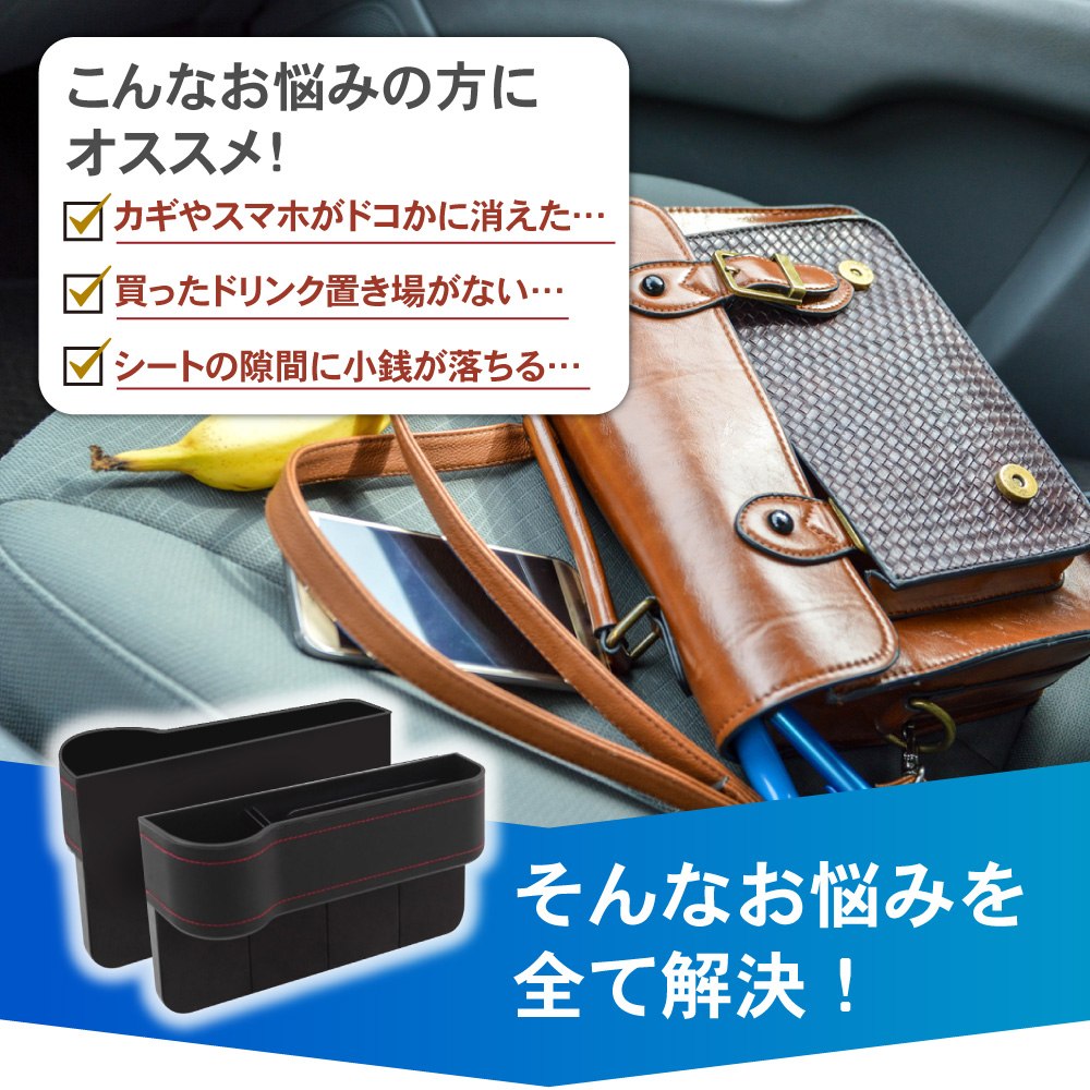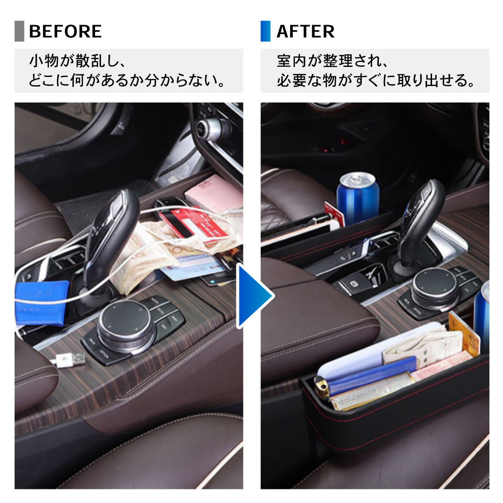 | 商品紹介 | 室内スッキリ、快適空間。 マルチにしまえて、ドライブ快適。 選べる3色、2個セット。サイド収納カーボックス。 ・POINT.1 「室内スッキリ。」 ・散らかる小物を、ササッと収納。 スマートドライブ、サイドポケット。 ----------------------------------------------------------------------------- (本品使用前) 小物が散乱し、どこに何があるか分からない。 (本品使用後) 室内が整理され、必要な物がすぐに取り出せる。 ----------------------------------------------------------------------------- ・POINT.2 「大容量。」 ・マルチタイプの、大容量収納。 カードにカギにスマートフォン。 たっぷりしまえる、整理整頓ボックス。 ------------------------------------------------------------------------------------- ボックス内を細かく仕切ることで、より整理しやすく。 ・各種小物 ・スマホ、小銭入れ ・カード、紙幣 ・ドリンク缶 ・etc,etc…… ――ドンドン入れられ、散らかりません。 ------------------------------------------------------------------------------------- ・POINT.3 「取付簡単。」 ・設置は一瞬。 シートのすき間にはさむだけ。 届いたその日に実装可能。手間暇いらずの収納ポケット。 ------------------------------------------------------------------------------------- 次のタイプの車には取り付け出来ません。 ・コンソールの位置がシートよりも5cm以上低い車。 ・コンソールとシートの間が3.5cm以上離れている車。 ・サイドブレーキ左寄りの場合は、運転席側のみOK。 ------------------------------------------------------------------------------------- ・POINT.4 「こだわり設計。」 ・ユーザー目線の最新設計。 様々なこだわりポイントが、使いやすさが更にアップ。 ------------------------------------------------------------------------------------- (こだわりポイント) 1.ケーブルホール スマホ充電もスマート。 2.防滑マット 小物のすべり防止に。 3.ドリンクホルダー ドリンク置き場としても・。 4.PVCレザー お手入れ簡単。 ------------------------------------------------------------------------------------- ・POINT.5 「選べる3色。」 ・車内に合わせる、3colors。 スタイル次第、気分次第。お洒落な3色ご用意しました。 ------------------------------------------------------------------------------------------- (選べる3色) ・ブラック(レッドステッチ) ・ブラウン ・ベージュ ------------------------------------------------------------------------------------------- ・POINT.6 「運転席+助手席セット。」 ・お得で便利な2個セット。 運転席側&助手席側で、よりよく収納スペース確保。 車内空間、有効活用。室内スッキリ、スマートドライブ。細部にこだわり、選べる3色。シート収納ポケットセット。 (このような商品をお探しのかたに) 車用 サイド収納ボックス 運転席用 助手席用 PU皮革 カーシート 隙間 ボックス 収納 ポケット カー用品 車内 車 便利グッズ 大容量 シートサイドポケット 携帯電話 現金 カード 鍵 リモコン 収納ポケット PUレザー シート収納ポケット シート ドリンクホルダー 2個セット 運転席 助手席 黒 茶 米色 選べる 選べる3色 ブラック ブラウン ベージュ |