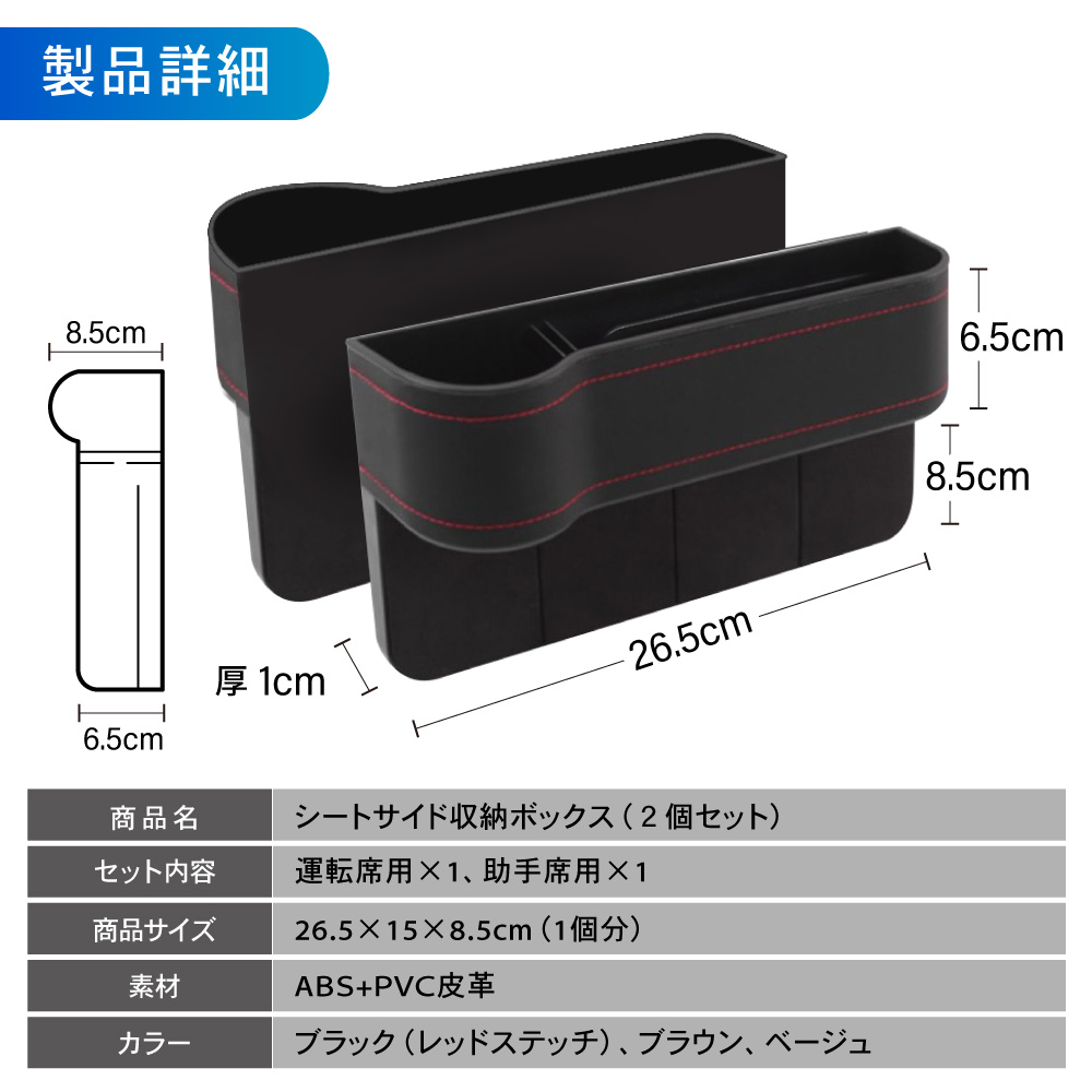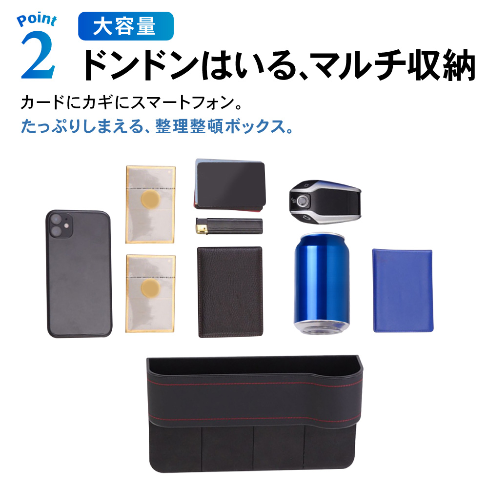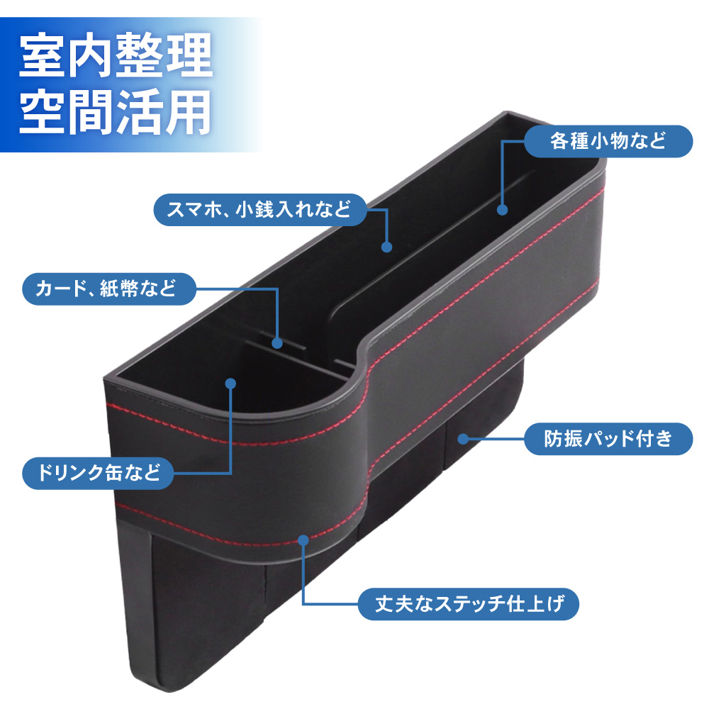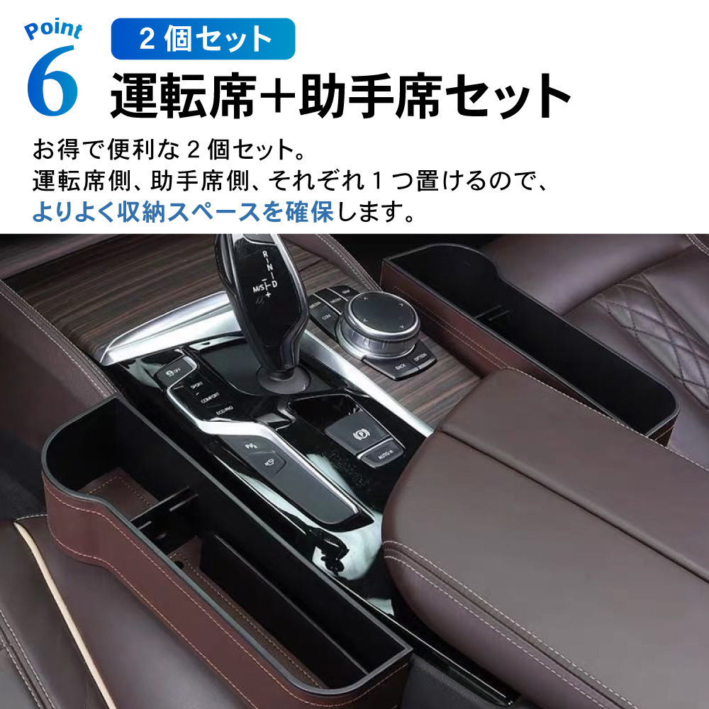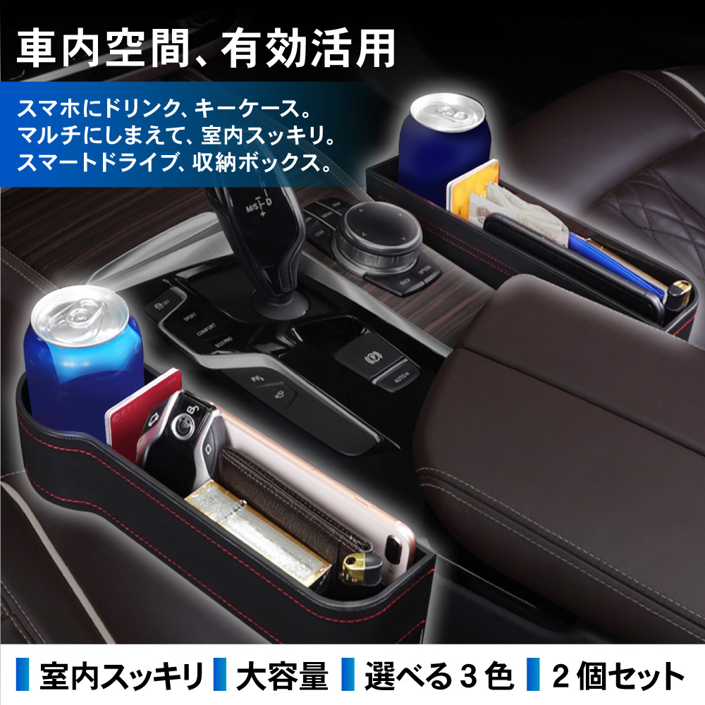 | 商品紹介 | 室内スッキリ、快適空間。 マルチにしまえて、ドライブ快適。 選べる3色、2個セット。サイド収納カーボックス。 ・POINT.1 「室内スッキリ。」 ・散らかる小物を、ササッと収納。 スマートドライブ、サイドポケット。 ----------------------------------------------------------------------------- (本品使用前) 小物が散乱し、どこに何があるか分からない。 (本品使用後) 室内が整理され、必要な物がすぐに取り出せる。 ----------------------------------------------------------------------------- ・POINT.2 「大容量。」 ・マルチタイプの、大容量収納。 カードにカギにスマートフォン。 たっぷりしまえる、整理整頓ボックス。 ------------------------------------------------------------------------------------- ボックス内を細かく仕切ることで、より整理しやすく。 ・各種小物 ・スマホ、小銭入れ ・カード、紙幣 ・ドリンク缶 ・etc,etc…… ――ドンドン入れられ、散らかりません。 ------------------------------------------------------------------------------------- ・POINT.3 「取付簡単。」 ・設置は一瞬。 シートのすき間にはさむだけ。 届いたその日に実装可能。手間暇いらずの収納ポケット。 ------------------------------------------------------------------------------------- 次のタイプの車には取り付け出来ません。 ・コンソールの位置がシートよりも5cm以上低い車。 ・コンソールとシートの間が3.5cm以上離れている車。 ・サイドブレーキ左寄りの場合は、運転席側のみOK。 ------------------------------------------------------------------------------------- ・POINT.4 「こだわり設計。」 ・ユーザー目線の最新設計。 様々なこだわりポイントが、使いやすさが更にアップ。 ------------------------------------------------------------------------------------- (こだわりポイント) 1.ケーブルホール スマホ充電もスマート。 2.防滑マット 小物のすべり防止に。 3.ドリンクホルダー ドリンク置き場としても・。 4.PVCレザー お手入れ簡単。 ------------------------------------------------------------------------------------- ・POINT.5 「選べる3色。」 ・車内に合わせる、3colors。 スタイル次第、気分次第。お洒落な3色ご用意しました。 ------------------------------------------------------------------------------------------- (選べる3色) ・ブラック(レッドステッチ) ・ブラウン ・ベージュ ------------------------------------------------------------------------------------------- ・POINT.6 「運転席+助手席セット。」 ・お得で便利な2個セット。 運転席側&助手席側で、よりよく収納スペース確保。 車内空間、有効活用。室内スッキリ、スマートドライブ。細部にこだわり、選べる3色。シート収納ポケットセット。 (このような商品をお探しのかたに) 車用 サイド収納ボックス 運転席用 助手席用 PU皮革 カーシート 隙間 ボックス 収納 ポケット カー用品 車内 車 便利グッズ 大容量 シートサイドポケット 携帯電話 現金 カード 鍵 リモコン 収納ポケット PUレザー シート収納ポケット シート ドリンクホルダー 2個セット 運転席 助手席 黒 茶 米色 選べる 選べる3色 ブラック ブラウン ベージュ |
