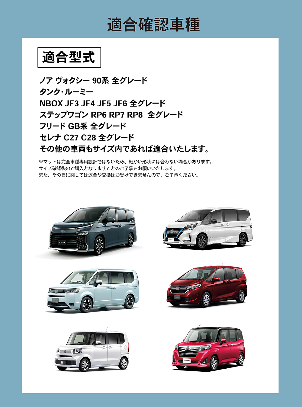 | 適合車種 | ノア ヴォクシー 90系 全グレード タンク・ルーミー NBOX JF3 JF4 JF5 JF6 全グレード ステップワゴン RP6 RP7 RP8 全グレード フリード GB系 全グレード セレナ C27 C28 全グレード シエンタ 10系 170系 その他の車両もサイズ内であれば適合いたします。 注意)マットは完全車種専用設計ではないため、細かい形状には合わない場合があります。 サイズ確認後のご購入となりますことのご了承をお願いいたします。 また、その旨に関しては返金や交換はお受けできませんので、ご了承ください。 |